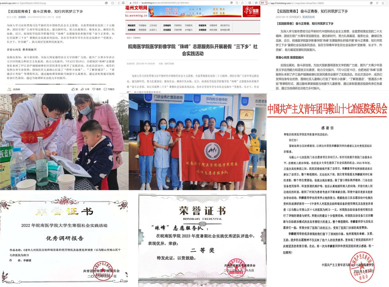 李麟豪积极投身寒暑假社会实践活动,带领“珠峰”志愿服务队成员在安徽省内开展一系列社会实践活动,并充分发挥专业优势,深入社区开展老年人护眼宣教及义诊等活动。此外,他还带领“珠峰”志愿服务队连续两年于寒暑假期间扎根马鞍山十七冶医院进行调研,形成调查报告并反馈给医院,被医院采纳落地,受益患者累计万人,进一步提升了马鞍山地区中老年群体诊疗体验,获得医院表彰,获芜湖民生网、亳州文明网等多家媒体报道,同时也更加坚定了他好好学习、奉献社会的理想信念。
