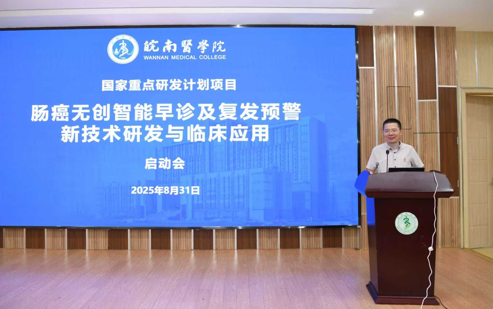 8月31日,国家重点研发计划项目“肠癌无创智能早诊及复发预警新技术研发与临床应用”(项目编号:2024YFF1206800)启动推进会暨学术研讨会在我校召开。学校党委副书记、院长姚应水致辞开幕,会议由我校第一附属医院(弋矶山医院)副院长赵军主持。