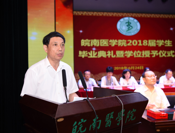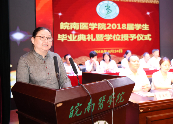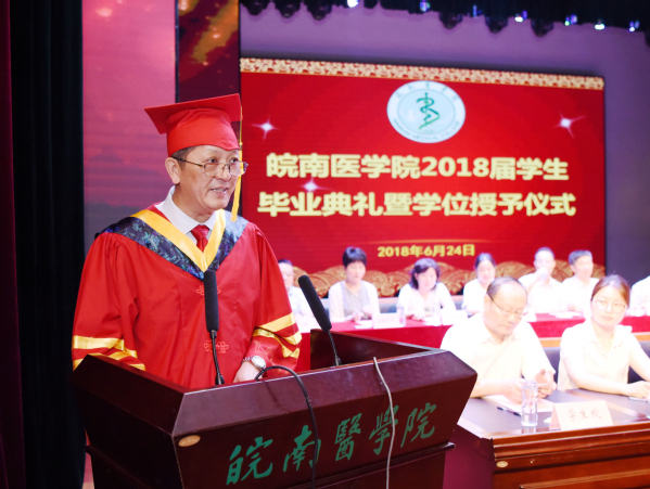 教师代表、药学院化学教研室吴运军教授对同学们表达了殷切期望,希望同学们牢记皖医精神,甘于寂寞,学会独立思考;坚守理想,敢于追求人生幸福;为人谦和,学会理解、感恩和坚强。重症护理学专业孙盼盼同学、临床医学专业庄晓鹏同学分别代表研究生和本专科毕业生发言,表达了对母校的诚挚谢意和惜别之情,表示将谨记母校校训,继承和发扬皖医精神,脚踏实地,敢于担当,奉献社会,在逐梦路上奋发向上、永不言弃,展现皖医人的风采。