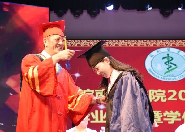 章尧发表了情真意切、热情洋溢的讲话。他首先代表学校向圆满完成学业的全体毕业生同学表示最真诚的祝贺,向一直关爱同学们成长成才的师长、家人及朋友表示由衷的感谢。他指出,学校的发展有同学们的贡献,同学们的进步离不开学校的付出。经过几年的学习和磨练,同学们德智体美全面发展,在各级各类专业竞赛和创新创业等大赛中屡获佳绩,并涌现出了8名临床医学专业学生实习期间抢救晕厥路人、2015级医学检验技术专业辛华同学为白血病患者捐献造血干细胞等先进事迹,以实际行动诠释了医者仁心。离别之际,章尧以“自强”一词语重心长寄语毕业生同学,希望大家要把握一个方向,夯实两个基础,抓住三个关键:一要不忘初心,挺起精神脊梁。人无精神不立,国无精神不强。人之所以能够历经挫折而不断奋起,历尽苦难而淬火成钢,靠的是精神、是理想、是信念。理想指引人生方向,信念决定事业成败。要自觉把个人理想同国家前途、自己人生同民族命运紧密联系在一起,在为人民谋幸福、为民族谋复兴的过程中实现人生价值。二要德才兼备,夯实人生基础。才者,德之资;德者,才之帅。德与才,是辩证统一的两个方面,也是我们立足社会的基本支点。要努力做到修德与长才相得益彰,明大德、守公德、严私德,自觉树立和践行社会主义核心价值观,同时不断加强学习,求真学问,努力在专业知识上达到和“大神”并肩的水平。三要把握关键,厚实自强底蕴。自强的关键是创新,中美贸易战和美国制裁中兴事件警醒我们,必须要自力更生、自主创新,要崇尚科学,敢为人先、勇于冒尖、不怕失败,积极抢占未来发展制高点。自强的关键是实干,空谈误国,实干兴邦。要以实干闯难关、以实干创佳绩,努力成为有理想、有学问、有才干的实干家。自强的关键是弘毅,士不可以不弘毅,惟有舍弃心浮气躁,敢于迎难而上、不懈坚持,才能找到人生价值的支点,积聚青春奋斗的能量,绽放青春的光芒。讲话最后,章尧勉励所有毕业生同学,“天行健,君子以自强不息。”梦在前方,路在脚下,仰望星空,脚踏实地。祝福同学们继续朝气蓬勃、自强不息,向着美好的未来奔跑,撷取时代的荣光!