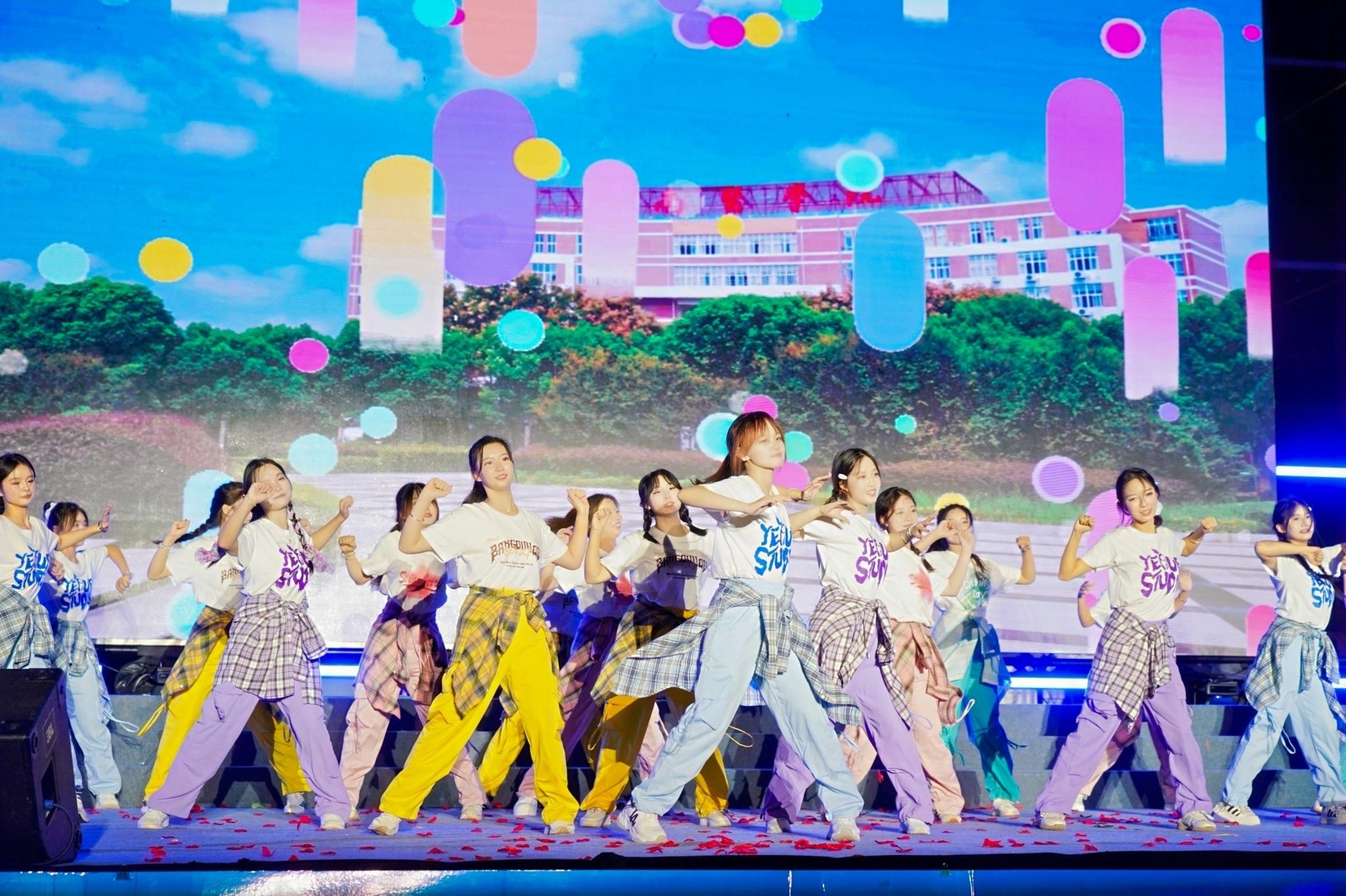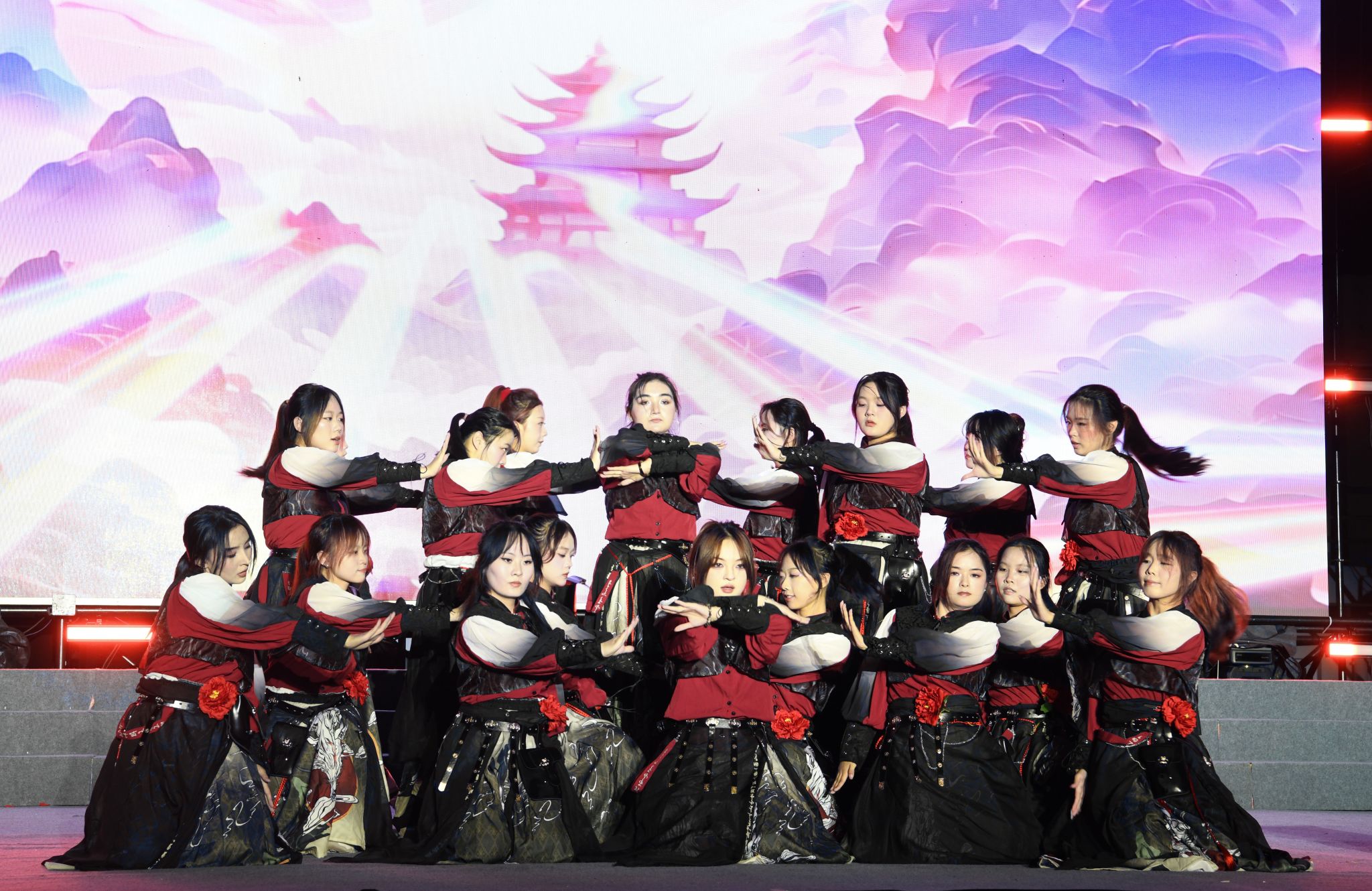 晚会在恢弘大气的开场龙鼓《旌旗半卷战九霄》中拉开帷幕;器乐合奏《就是哪吒》展现传统文化和当代精神的激情碰撞,传递“打破束缚、勇往直前”的青春无畏;军事爱好者协会带来的队列表演《钢铁洪流》刚劲有力,英姿勃发、气贯长虹,让人回想起抗战胜利80周年阅兵时的震撼场景;参加九三阅兵的两名在校退役大学生代忠意、张允乔现场分享他们通过层层选拔、经历刻苦训练,最终走到天安门阅兵现场的心路历程,一句“脚下的安宁是先辈热血换来的”让全场掌声雷动,经久不息;新生辅导员代表唱响纪念中国人民抗日战争暨世界反法西斯战争胜利80周年主题歌曲《铭记》,追忆烽火岁月,致敬伟大抗战精神,点燃在场师生心底的家国情怀,引发强烈共鸣;舞蹈《山河图》展现祖国大好河山,以今天的繁华盛世回应英雄先烈,书写这封跨越时空的家书;中外学生歌曲联唱《如是》唱出了青年人坚守初心、拼搏奋进的意气风发和追光而行,初心如炬的坚定昂扬。
