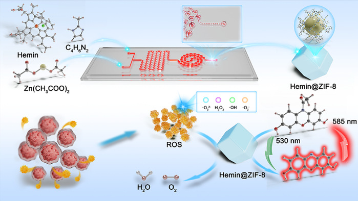用于细胞ROS传感的Hemin@ZIF-8微流体合成示意图