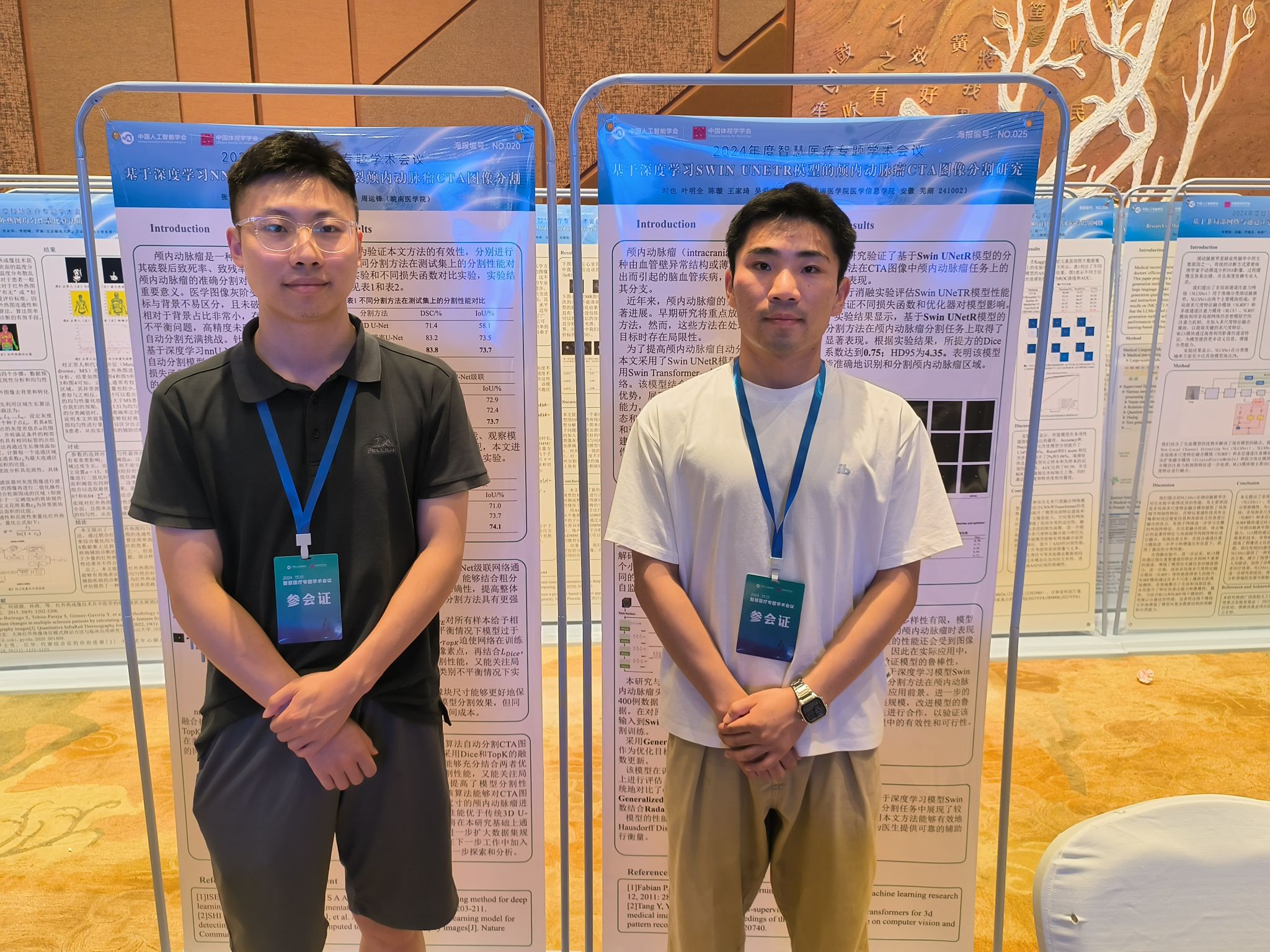 中国人工智能学会理事长、清华大学信息学院院长戴琼海院士,中国人工智能学会智慧医疗专委会主任委员、北京科技大学班晓娟教授分别在开幕式上致辞。会议邀请了北京大学人民医院院长王俊院士,国家杰出青年科学基金获得者、中国科学院自动化研究所田捷研究员、北京中医药大学副校长陶晓华教授等分别作题为《肺癌手术智能辅助模块的探索》《人工智能和医疗大数据加速基础到临床的跨越》《中医古籍整理与临床应用的信息化路径探索》的特邀报告。会议还设置了青年论坛、分组论坛、海报展示与汇报交流等,围绕智能医学影像处理、智能生物信息处理、智慧中医药、健康医疗大数据分析与大模型应用等前沿领域展开深入研讨。我校师生共展出2份海报,涉及颅内动脉瘤CTA图像处理与分割研究方向。